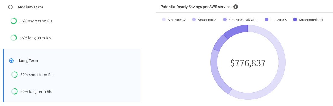 This chart shows the yearly savings that can be achieved with reserved instances per AWS service. The figures in this chart vary according to the strategy you choose.