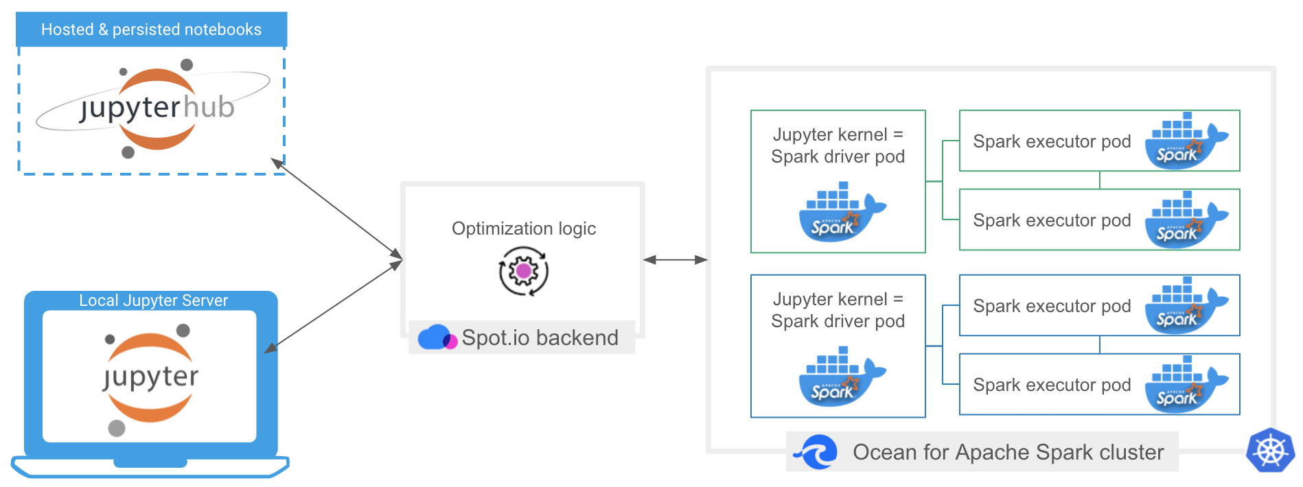 The Jupyter notebook server has an option to specify a gateway service in charge of running kernels on its behalf. Ocean Spark can fill this role and enables you to run Jupyter Spark kernels on the platform.
